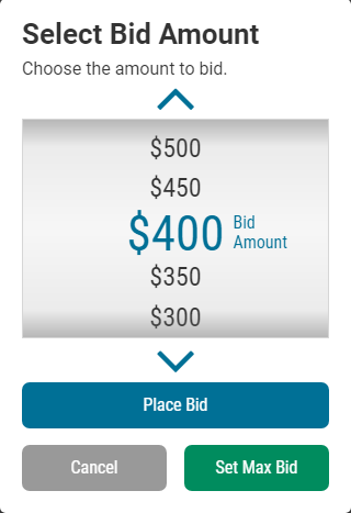 - Set a maximum amount by selecting Bid More, then use the bidding wheel to select your Max Bid. The system will automatically place a bid on your behalf whenever someone bids against you, up to your Max Bid amount.